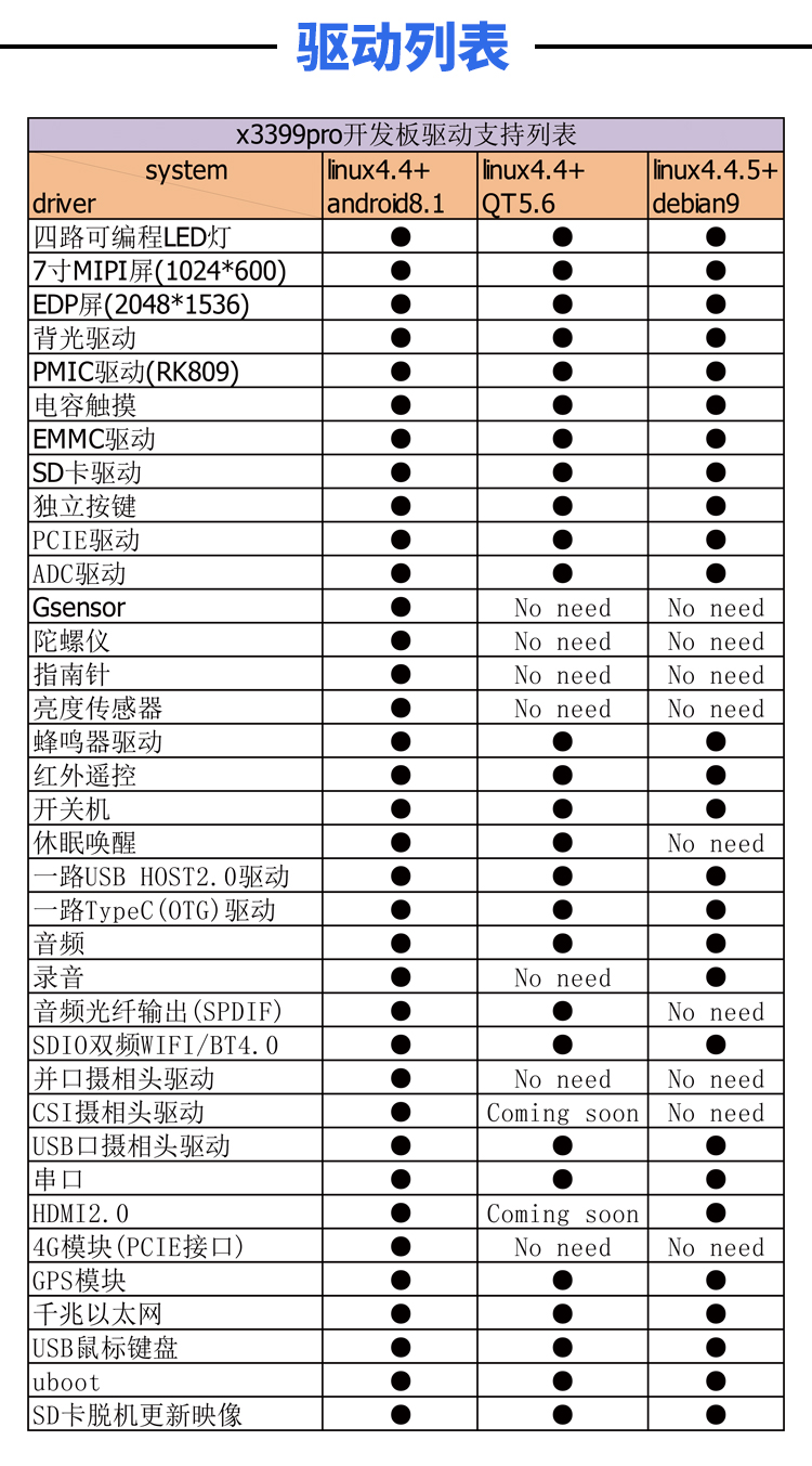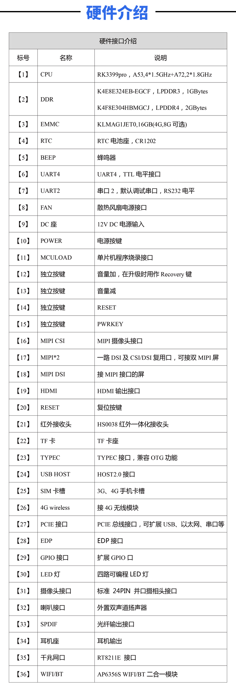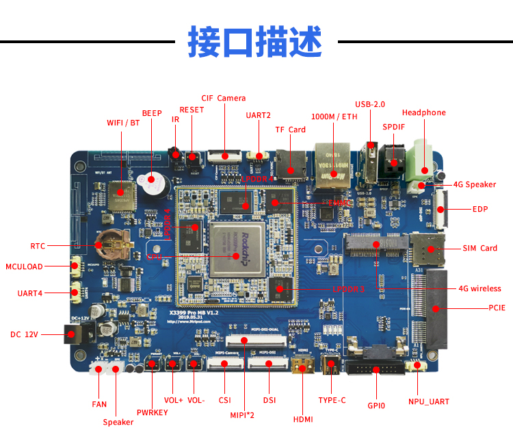 示3399pro芯片的全部功能,板载千兆以太网接口、PCIE 接口、CSI、DSI接口、HDMI接