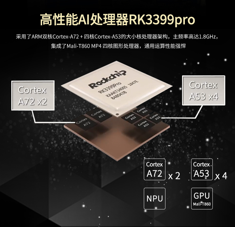 RK3399Pro 具有超强的计算性能,其采用大小核 CPU 架构,拥有双核 A72+四核 A53,